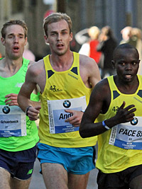Hoffnungsschimmer - Comeback von Pollmächer und CierpinskiBei den deutschen Männern gab es wieder einen Schimmer am Horizont. Nach längerer Durststrecke mit Verletzungspausen meldete sich André Pollmächer zurück. Zuletzt hatte er 2009 einen Marathon beendet. Mit einer neuen persönlichen Bestzeit von 2:13:05 Stunden belegte er Rang 14 und unterbot als einziger deutscher Läufer die Norm von 2:13:30 Stunden für die Europameisterschaften 2014. Im Ziel war er nicht unzufrieden, "aber es wäre mehr drin gewesen, wenn ihn nicht Krämpfe geplagt hätten," so der Düsseldorfer. Nun – an der Leistungsgrenze ist das nun mal so. Er sei im letzten Drittel auf Sicherheit gelaufen und hätte erst auf den letzten zwei Kilometern wieder forciert. Für das Selbstbewusstsein war diese "Sicherheitslauftaktik" sicherlich vollkommen in Ordnung. Die deutsche Marathon Bestenliste wurde auch durch die Leistung von Falk Cierpinski, der ebenfalls einem jahrelangen Verletzungs- und Seitenstechen-Jammertal entstieg, mit 2:14:50 auf Platz 18 aufgemischt. Vitaly Rybak mit 2:15:39 Stunden als 19. und Marcin Blazinski in 2:17:53 Stunden als 23. blieben ebenfalls noch unter 2:20 Stunden. Das ist sicherlich kein Maßstab für Weltklasse, aber doch besser als im letzten Jahr wo lediglich Jan Fitschen in Berlin unter 2:20 Stunden einlief.
