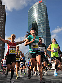 Kenianische Dominanz auch bei den DamenFlorence Kiplagat, ebenfalls aus Kenia/Iten konnte ihren Sieg von 2011 wiederholen. Das nur 1,55 Meter große 26-jährige Leichtgewicht (52 kg) gewann nach etwas zu schnellem Beginn auf unter 2:19 Stunden vor ihrer Landsfrau Sharon Cherop. Die Halbmarathonmarke passierte Florence Kiplagat in immer noch flotten 69:48 Minuten. Fünf Kilometer vor dem Ziel löste sie sich von ihrer zwischenzeitlich aufschließenden Landsfrau. „Ich habe mich zunächst sehr gut gefühlt, doch dann bekam ich aufgrund einer Blase Probleme mit meinem rechten Fuß“, erklärte die Siegerin, die mit 2:21:13 immerhin die drittbeste Zeit des Jahres erzielte. Sharon Cherop erreichte mit 2:22:28 als Zweite eine persönliche Bestzeit. Die Äthiopierinnen spielten in Berlin ebenfalls keine Rolle. Bei der Pressekonferenz hatte Kiplagat, offenbar komplett verausgabt, sichtlich Schwierigkeiten auf das Podium zu steigen.