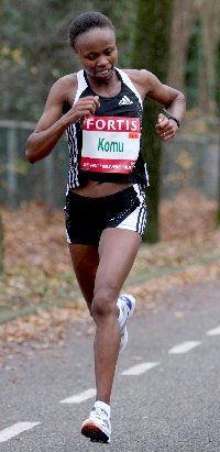 Kenia gegen Äthiopien - Teil II Die Frauen waren bei der Hälfte mit 72:12 Minuten mit Martha Komu, Alice Timbili (beide Kenia) und der auf der Papierform mit 2:25:42 Stunden Schnellsten Worknesh Tola aus Äthiopien mit ihrer Landsfrau Shitaye Gemechu in Reichweite des Streckenrekordes (Marleen Renders NED, 2:23:05 Stunden, 2002). Die Kenianerin Komu machte alleine das Tempo während sich die Äthiopierinnen taktisch nur auf die Verfolgungsarbeit konzentrierten. Die um einen neue persönliche Bestzeit bemühte 24-jährige Martha Komu (bisher 2:32:45, 1. Reims Marathon 2006) hatte die lauernde Äthiopierin Gemechu auf den letzten Kilometern wie eine Klette im Schlepptau. Gemechu zog erwartungsgemäß einen Kilometer vor dem Ziel scheinbar locker an und konnte bereits 10 Meter zwischen sich und die Kenianerin bringen. Alles schien klar, doch die kämpferische Komu bäumte sich noch einmal auf und suchte ihr Heil in der Flucht nach vorne. Auf der Zielgerade passierte sie Gemechu, die keine Gegenwehr mehr leisten konnte, und gewann "gerecht" ihr Rennen in 2:25:33 Stunden. Gemechu wurde in 2:25:37 Stunden Zweite. Als Dritte kam die Kenianerin Lehna Cheruyiot in 2:26:00 Stunden noch aufs Treppchen.